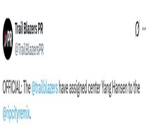 1月15日,开拓者官方宣布,球队已将中锋杨瀚森下放至G联盟混音队。